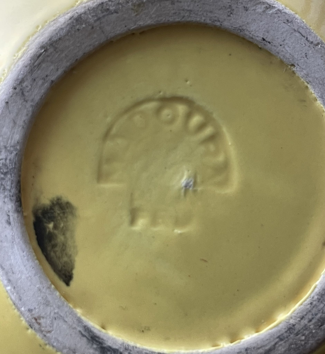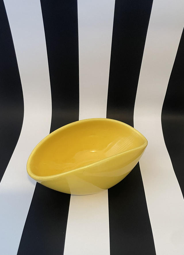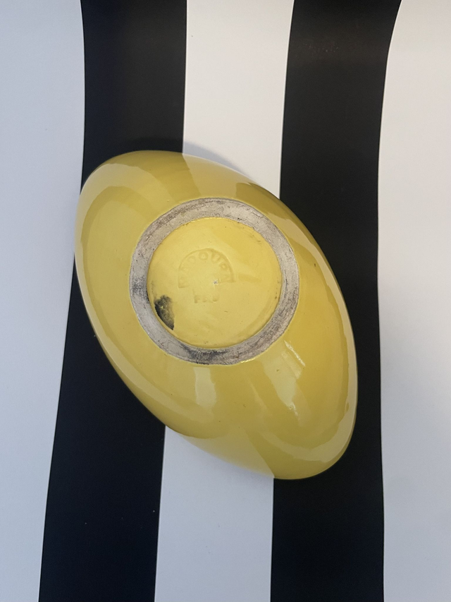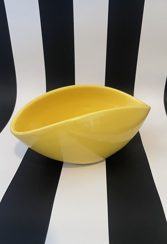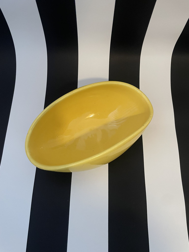 Coupe de forme oblongue en céramique émaillée de couleur jaune.