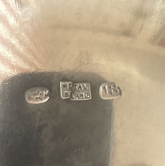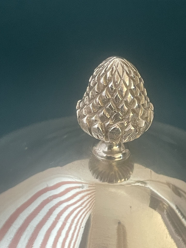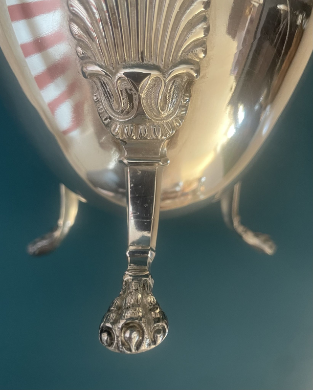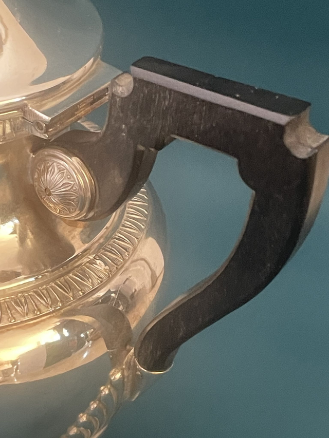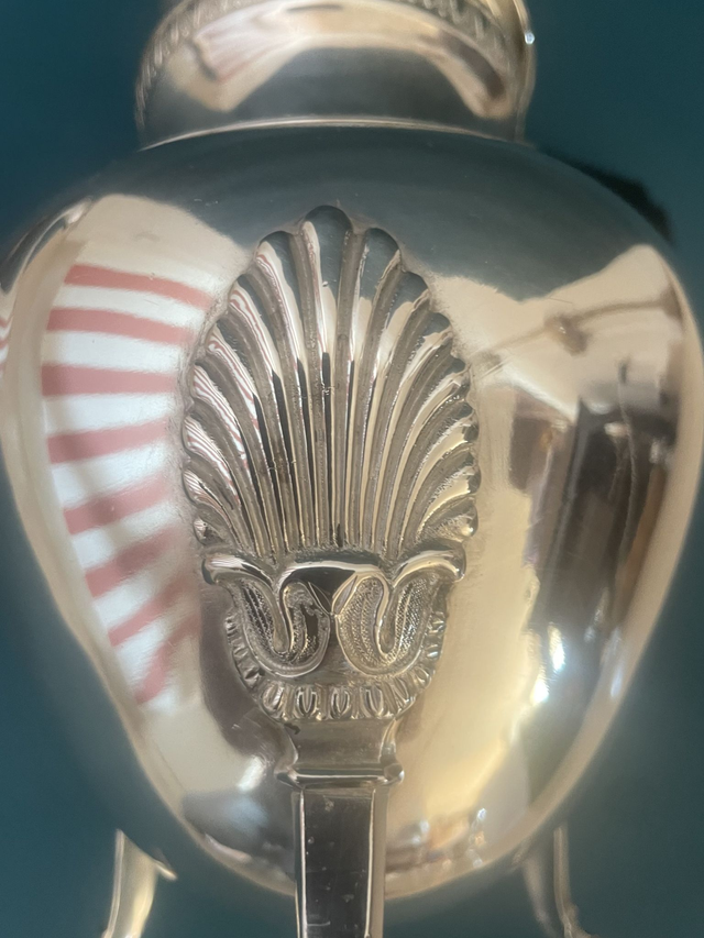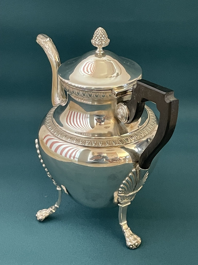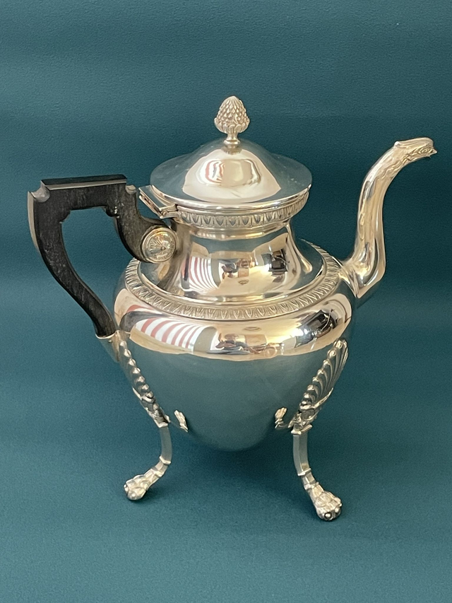Verseuse tripode en métal argenté de style Empire, présentant un décor de palmettes, d'une frise stylisée, d'un bec verseur en tête d'aigle, d'une prise en forme de pomme de pin. Elle repose sur trois pieds terminés en pattes de lion. La anse est en bois.